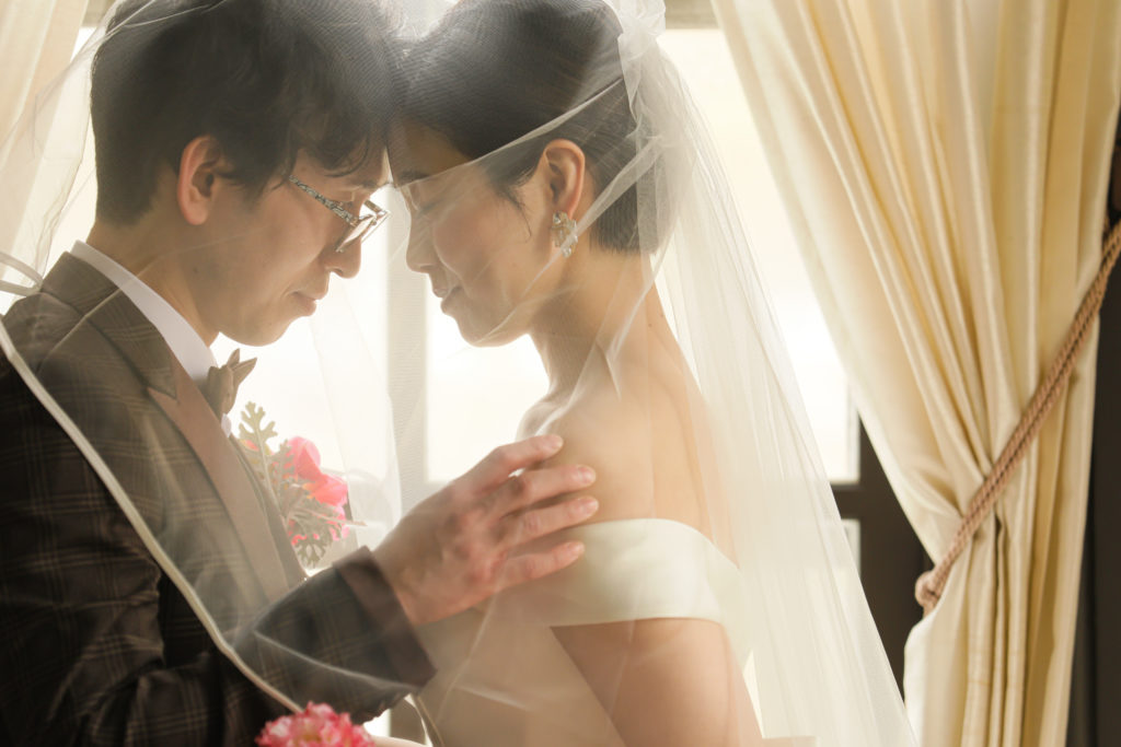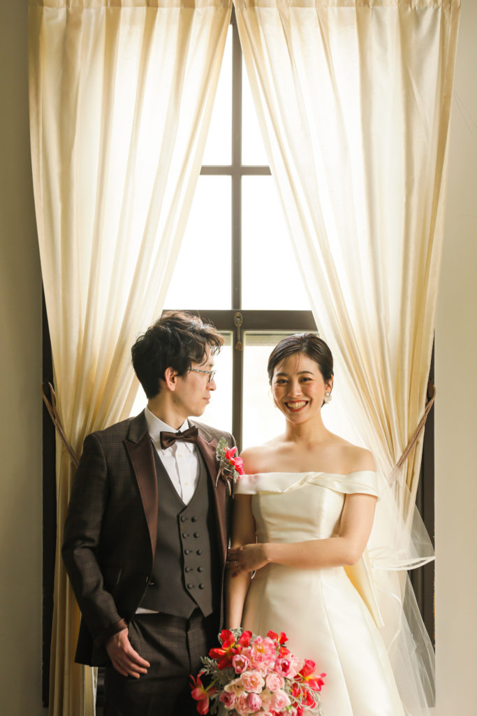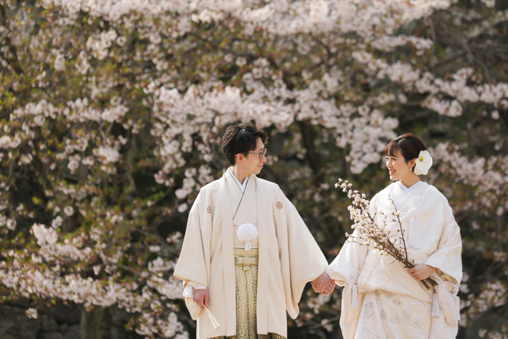 カクテルドレスはカジュアル。ウェディングはレトロな雰囲気にスタイリングさせていただきました。和装は桜が満開の時期でとても素敵でした!
